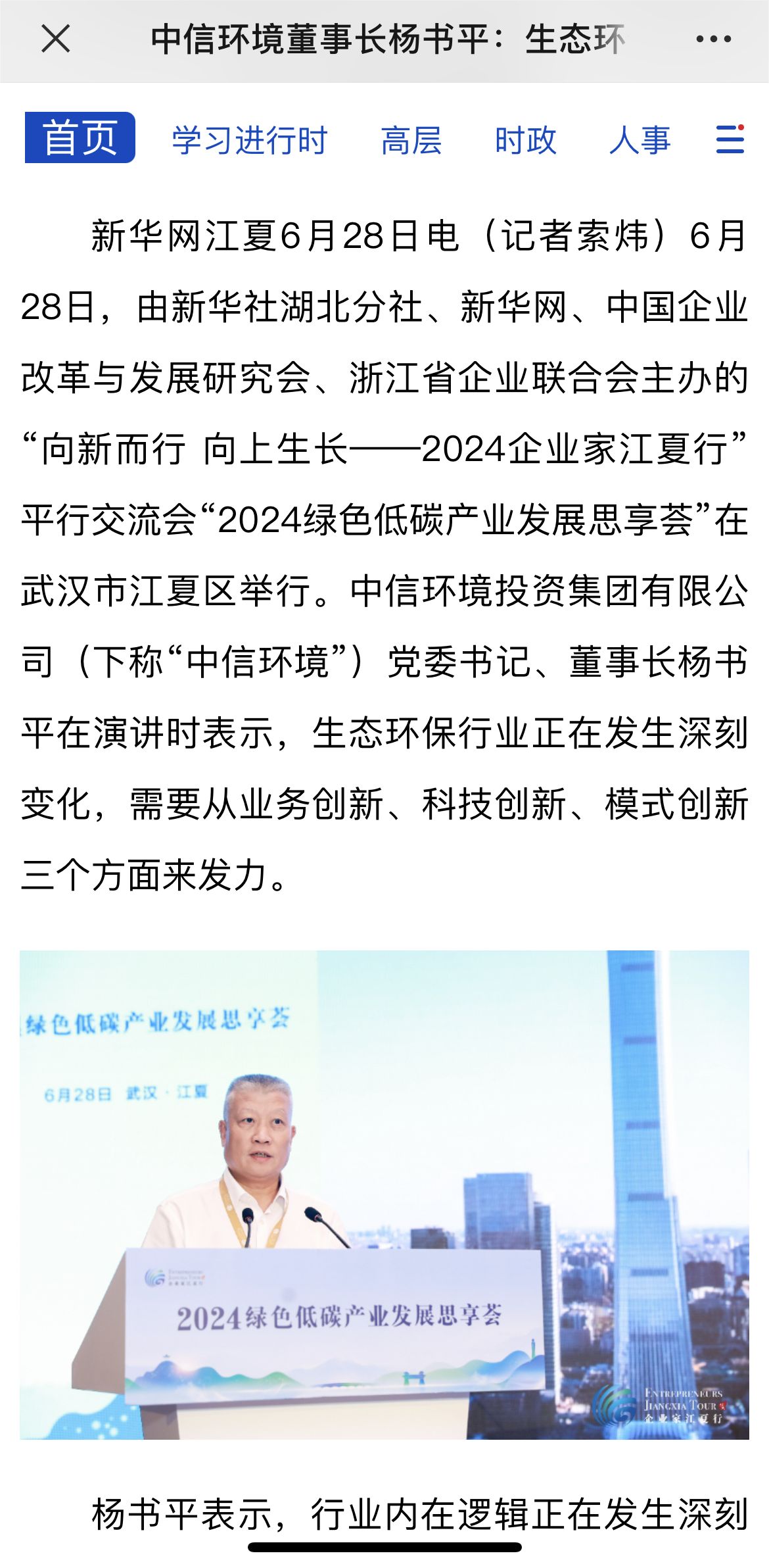 6月27日至29日,新华社湖北分社、新华网等单位在武汉联合举办“向新而行 向上生长——2024企业家江夏行”活动。中信环境党委书记、董事长杨书平出席主活动及2024新质生产力发展案例征集启动仪式,发表主旨演讲,并作主题对话。活动期间,国内政界、商界、学界和媒体界与会代表汇聚一堂,共享思想盛宴,共论高质量发展的新格局、新机遇。